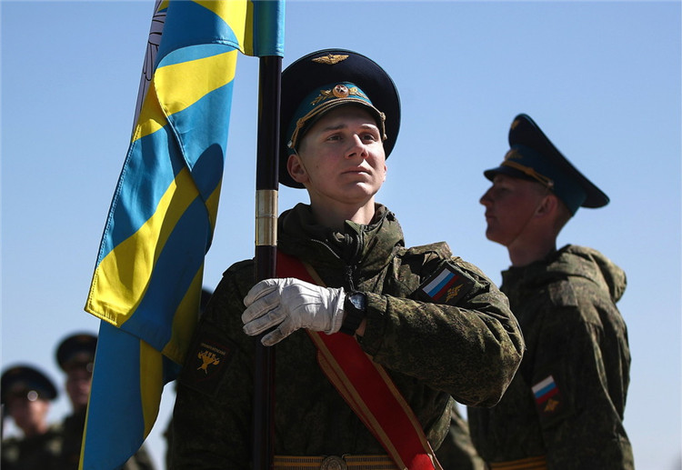 Un militar durante un ensayo para el desfile militar que marca el 74 aniversario de la Victoria sobre la Alemania nazi en la Gran Guerra Patria de 1941-45, el Frente Oriental de la Segunda Guerra Mundial, en Moscú, Rusia, 17 de abril de 2019.