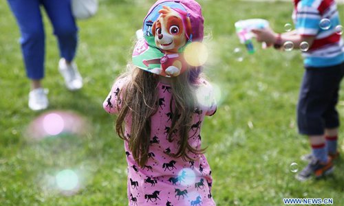 Una niña jugando con burbujas durante una celebración de Pascua en París, Francia, 22 de abril de 2019.