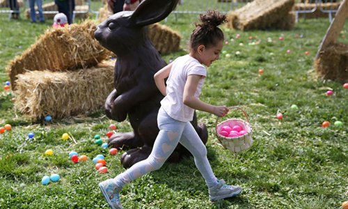 Una pequeña recogiendo huevos pintados durante una celebración de Pascua en París, Francia, 22 de abril de 2019.