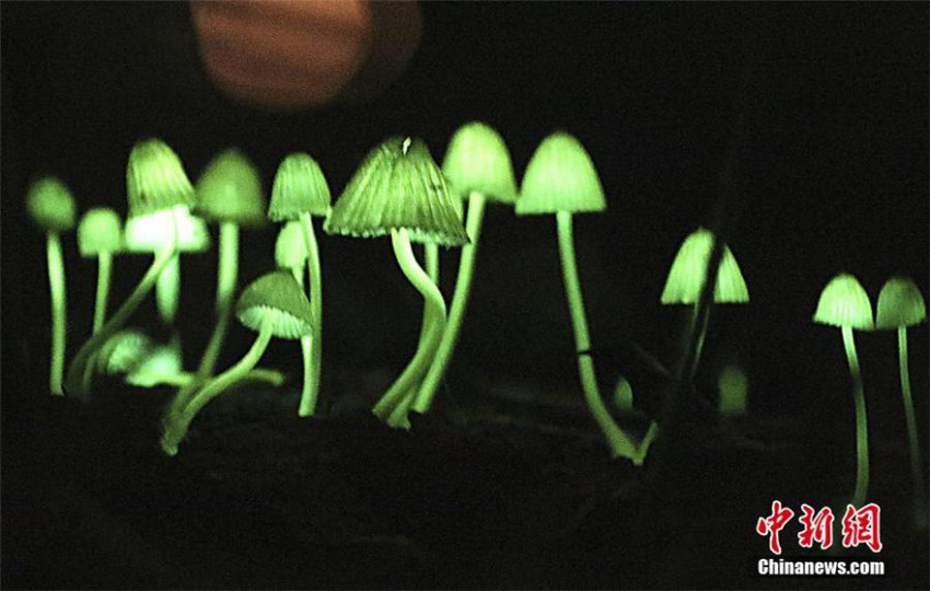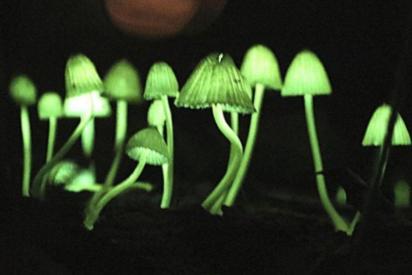 Setas luminosas en un bosque en Nachikatsuura, Prefectura de Wakayama, Japón. El hongo emite una luz verde brillante cuando cae la noche.