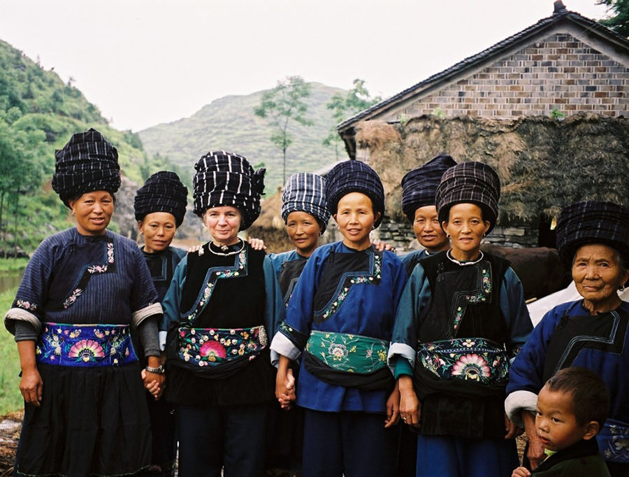 Dorothy Lacy, tercera de la izquierda, y algunas de las artesanas que crean bordados para el sitio web Shenaini posan con traje tradicional Miao en 2006.