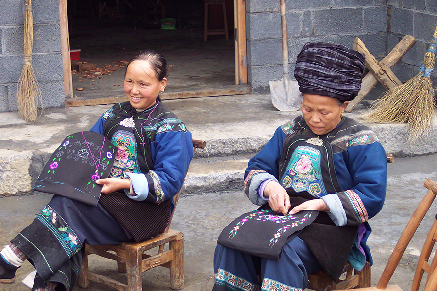 Las mujeres Miao bordan flores en bolsas.