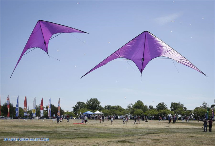 Personas vuelan cometas durante el Festival de Cometas de la Costa del Pacífico, en el Parque Garry Point en Richmond, Canadá, el 16 de junio de 2019. El festival atrajo a miles de entusiastas de las cometas y voladores profesionales de de cometas.