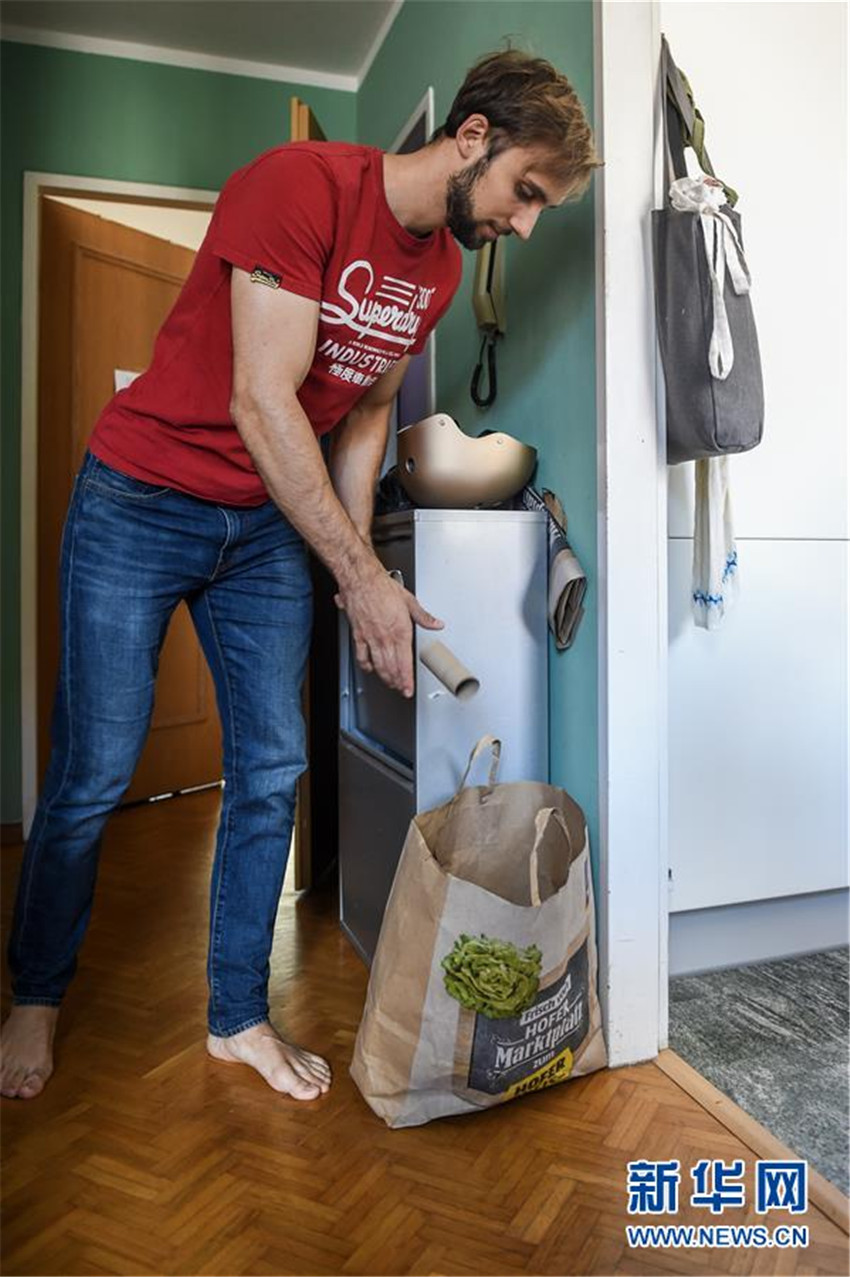 10 de julio, en Viena, Austria, Lebner, un residente local, gestiona en casa los desechos de papel. Lebner sostiene que, en general, los austriacos preubican diferentes pequeños contenedores de residuos en sus hogares de acuerdo con los botes en los lugares de la clasificación de basura para facilitar el trabajo a la hora de arrojarlos.