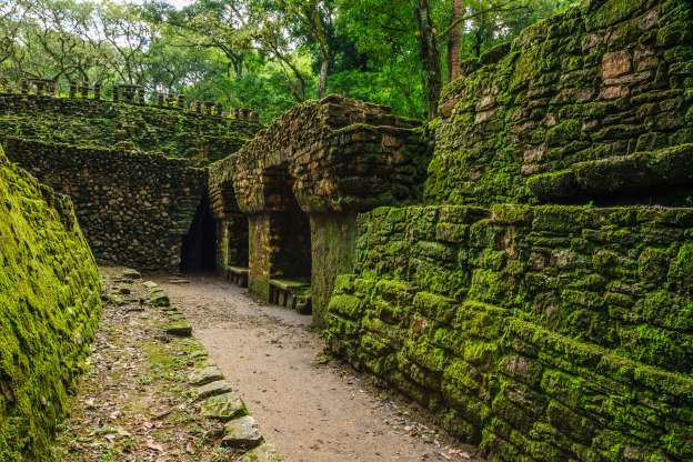 Uno de los lugares más famosos de las ruinas es el "Laberinto" (en la foto), un pasillo oscuro que conduce a la plaza principal. Otros edificios importantes incluyen la Estructura 33, el Templo 44, el Dintel 24, entre otros.