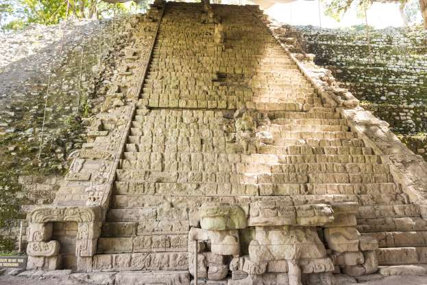 Las estructuras importantes de las ruinas incluyen la Acrópolis y sus plazas, así como la Plaza de los Monumentos, que alberga la famosa Escalera Jeroglífica (en la foto), con 62 escalones.