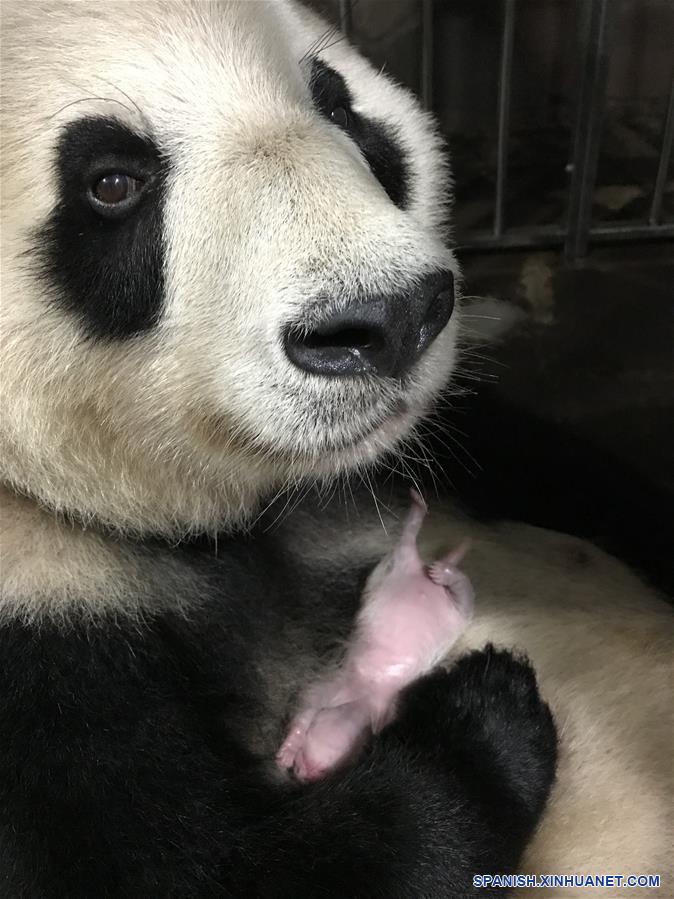 Imagen del 6 de julio de 2019 de la mamá panda Lanxiang sosteniendo un cachorro recién nacido en sus brazos en un zoológico, en la municipalidad de Chongqing, en el suroeste de China. Dos osas panda gigantes dieron a luz el pasado 23 de junio a sendos pares de gemelos en un zoológico de la municipalidad de Chongqing, en el suroeste de China, según informó el martes el zoológico. La panda gigante hembra Lanxiang, de 17 años, parió un par de cachorros machos en las primeras horas del 23 de junio, que pesaron 167 y 115 gramos, respectivamente. Otra hembra, Mangzai, alumbró dos cachorras esa misma tarde, que pesaron a su vez 142 y 160 gramos, respectivamente.