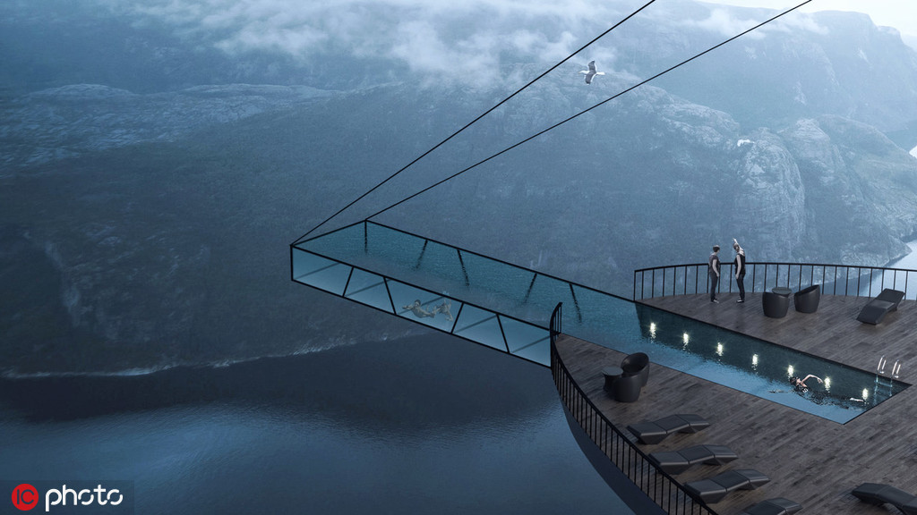 En la parte más baja, una piscina, larga y angosta, se vuelve una prolongación de la cara del acantilado, con un mirador de cristal que ofrece un lugar para que los huéspedes se relajen.