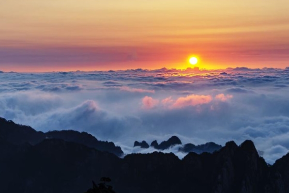 El magnífico amanecer en el lugar pintoresco de la Montaña Huangshan en la provincia de Anhui, 15 de agosto.