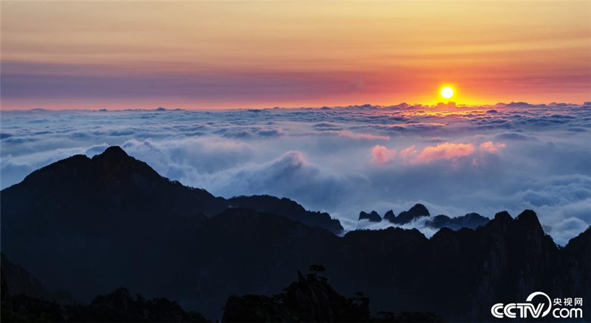 El magnífico amanecer en el lugar pintoresco de la Montaña Huangshan en la provincia de Anhui, 15 de agosto.