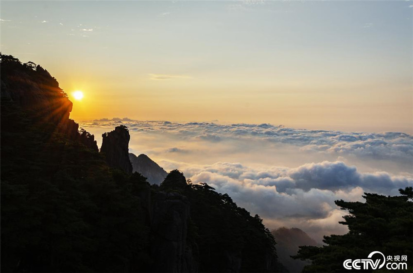El magnífico amanecer en el lugar pintoresco de la Montaña Huangshan en la provincia de Anhui, 15 de agosto.