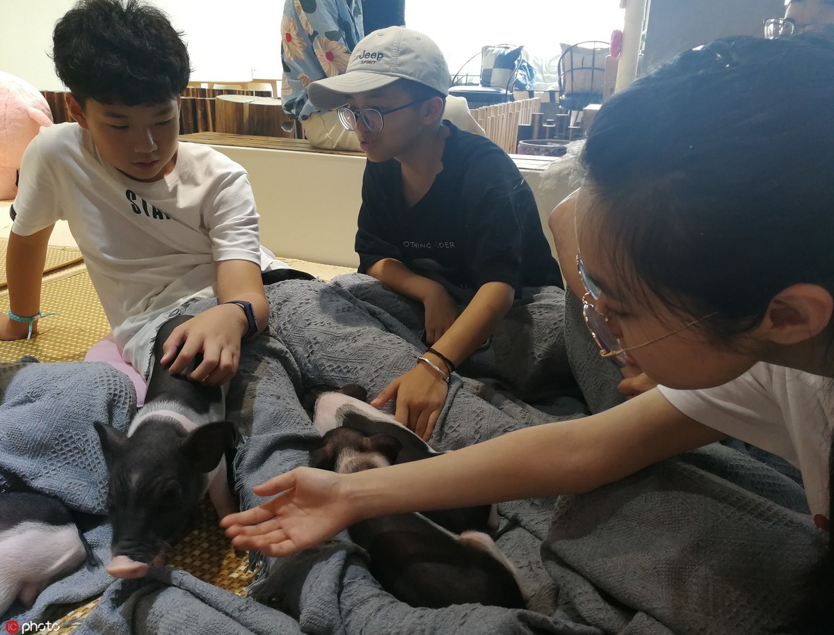 Niños acariciando algunos cerditos en un café en Hangzhou, provincia de Zhejiang, este de China, 24 de agosto de 2019.