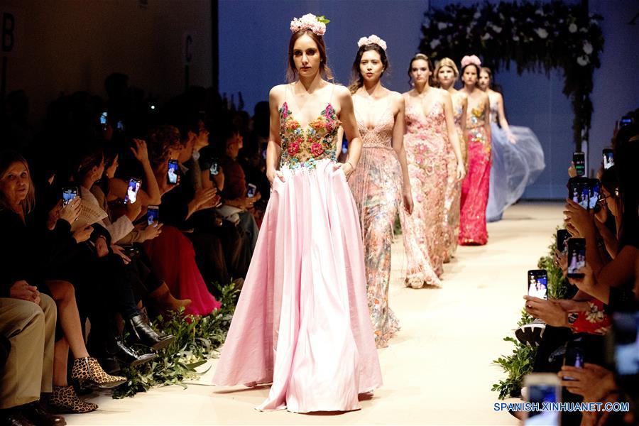 Imagen del 10 de octubre de 2019 de modelos presentando creaciones de la diseñadora peruana María Ximena, durante la semana de la moda "LIF Week Primavera-Verano 2019-2020", en Lima, Perú.