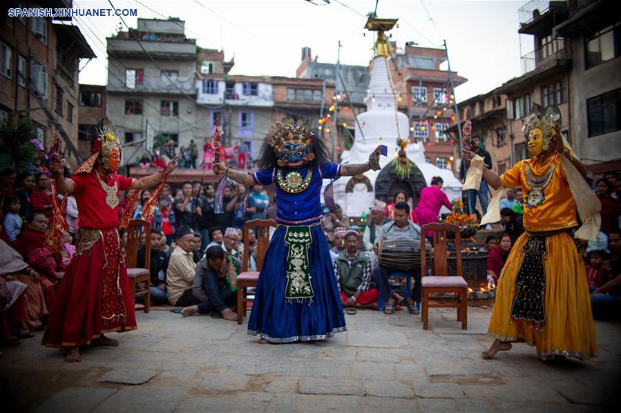 Bailarines enmascarados realizan danza Devi Nach en Nepal