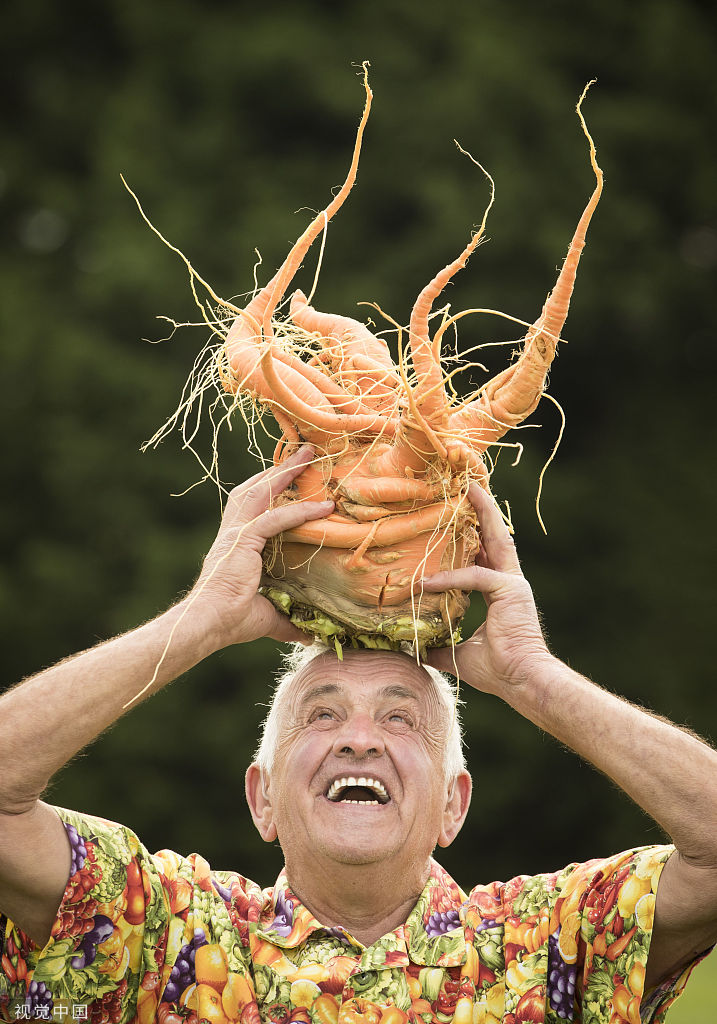 Ian Neale cría la zanahoria gigante con un peso de 4,29 kg que ganó más pesado en su clase durante la competencia de verduras gigantes en el Harrogate Autumn Flower Show en Yorkshire, Reino Unido, 14 de septiembre de 2018.