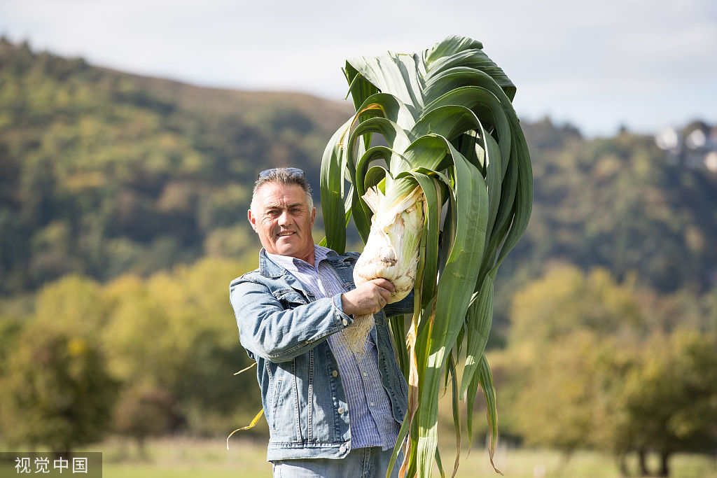 Paul Rochester posa con su puerro gigante récord mundial con un peso de 10,7 kg, superando su antiguo récord mundial en 0,1 kg en el Campeonato Nacional de Verduras Gigantes del Reino Unido CANNA en el Reino Unido, 28 de septiembre de 2018.