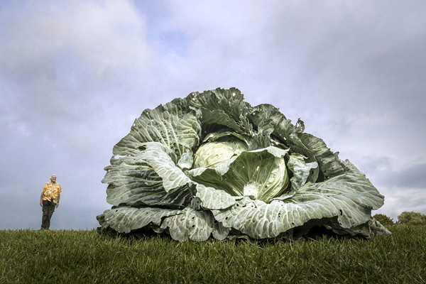 Ian Neale posa con su col gigante ganadora, la más pesada de su clase, con un peso de 30,2 kg durante la competencia de verduras gigantes en el Harrogate Autumn Flower Show en Yorkshire, Reino Unido, el 14 de septiembre de 2018.