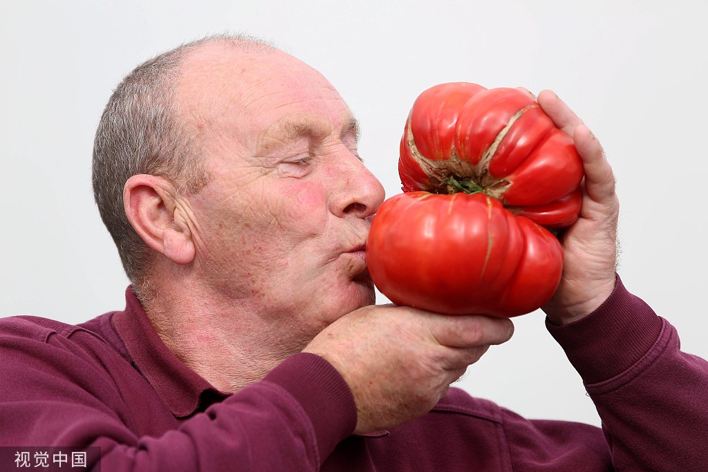 El mayor ganador de tomate Joe Atherton besa su ganadora de 1,7 kg de verdura, en el Harrogate Autumn Flower Show en el Reino Unido, el 18 de septiembre de 2015.