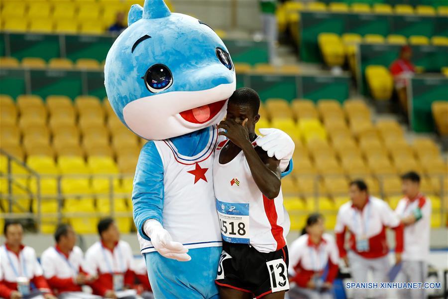 Tougma Taghoui, de Togo, es abrazado por la mascota Bingbing después de terminar la final los 10.000m de atletismo de los 7 Juegos Mundiales Militares del Consejo Internacional del Deporte Militar, en Wuhan, capital de la provincia de Hubei, en el centro de China, el 23 de octubre de 2019.