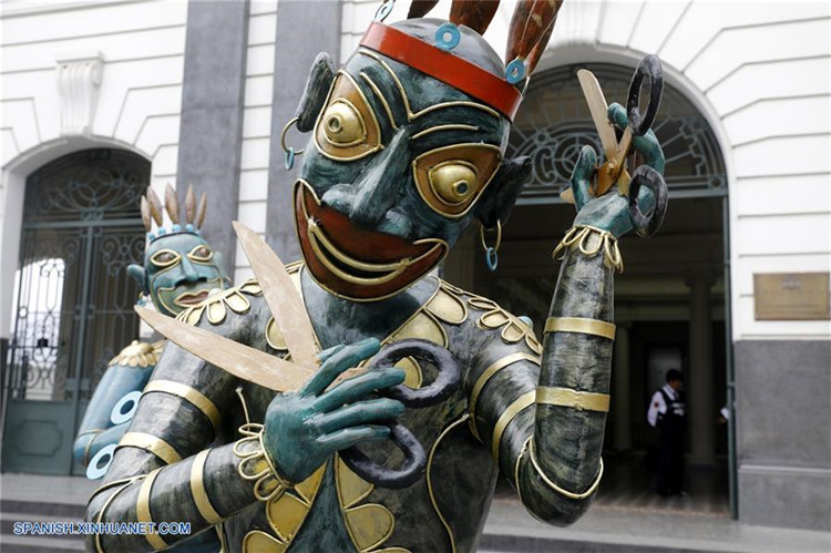 Imagen del 30 de octubre de 2019 de las esculturas de fierro policromado del artista peruano Alberto Quintanilla, que son expuestas a la entrada de la Casa de la Literatura Peruana, en el centro histórico de Lima, Perú.