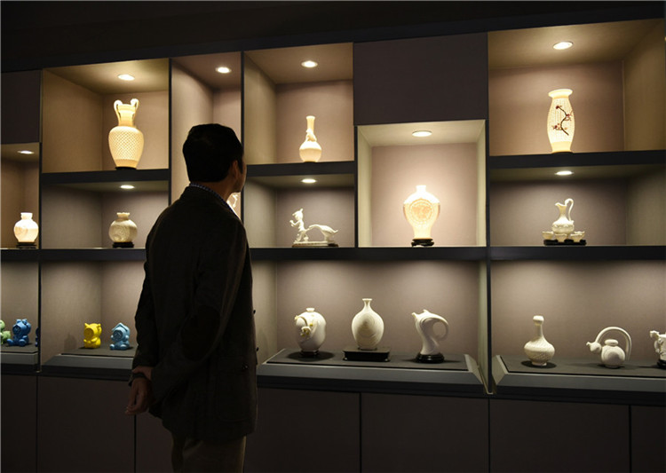 Una sala de exposiciones abarrotada de exquisitas creaciones de porcelana de Chen Minghua en Dehua, provincia de Fujian, este de China, 14 de noviembre de 2019.