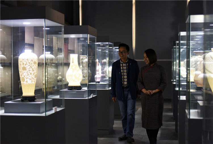 Una sala de exposiciones abarrotada de exquisitas creaciones de porcelana de Chen Minghua en Dehua, provincia de Fujian, este de China, 14 de noviembre de 2019.