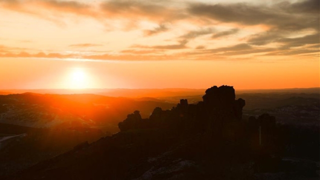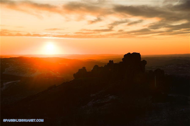 Imagen del 25 de noviembre de 2019 del crepúsculo en el punto escénico del bosque de piedras Hexigten, en la bandera de Hexigten de la ciudad de Chifeng, en la región autónoma de Mongolia Interior, en el norte de China. El bosque de piedras de Hexigten es un punto escénico con calificación de nivel 5A, la mayor calificación en China. El bosque de piedras creado naturalmente es famoso por sus formas de piedras únicas.