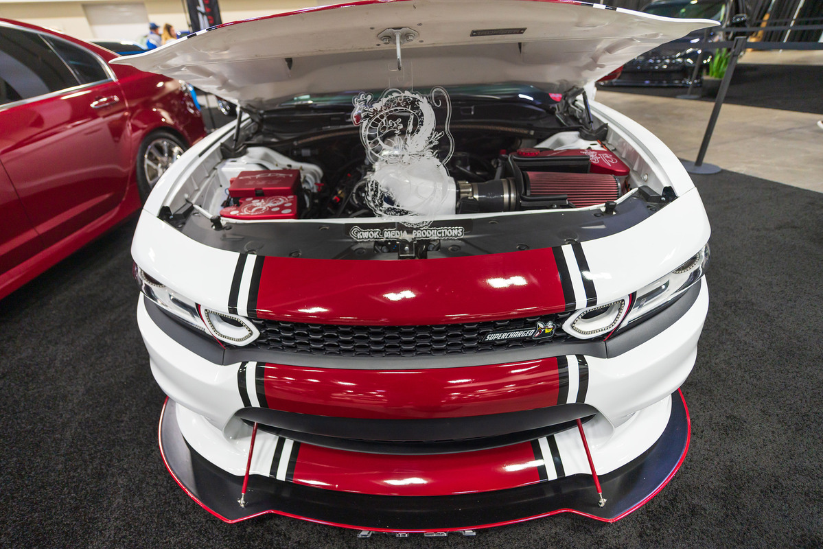 Un auto deportivo modificado brilla en la Exhibición Internacional de Autos de San Francisco, California.