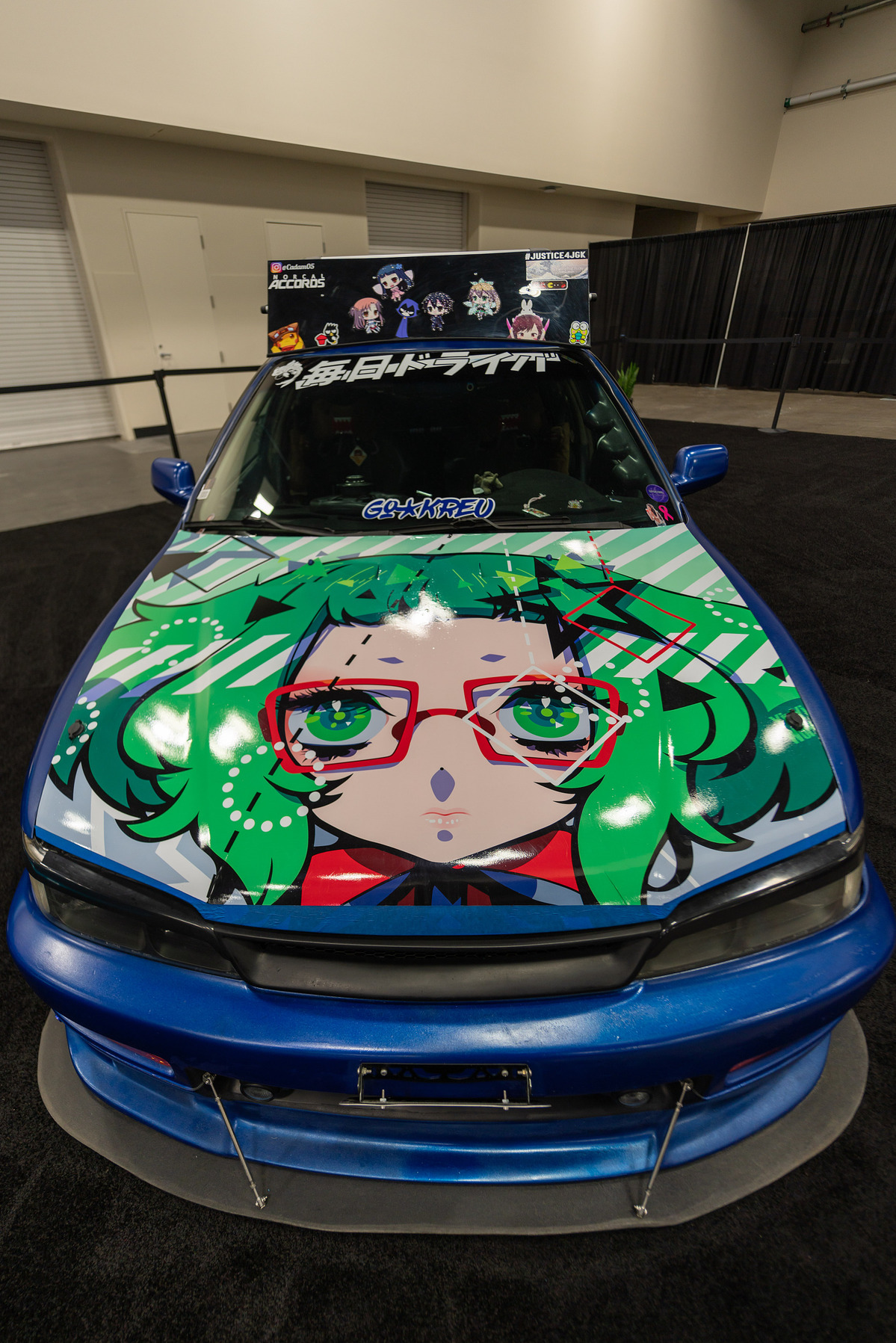 Un personaje de dibujos animados brilla sobre el chasis de un auto en la edición número 62 de la Exhibición Internacional de Autos de San Francisco, California.