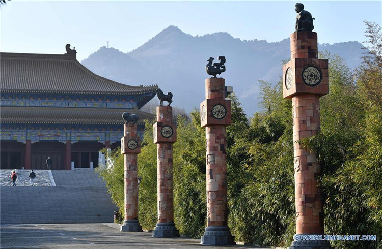 Imagen del 5 de diciembre de 2019 de pilares de piedra tallada en el lugar escénico cultural taoísta del Templo Louguantai del distrito Zhouzhi en Xi'an, capital de la provincia de Shaanxi, en el noroeste de China. El Templo Louguantai es el lugar donde el filósofo chino Laozi, fundador del taoísmo, predicó sus pensamientos.