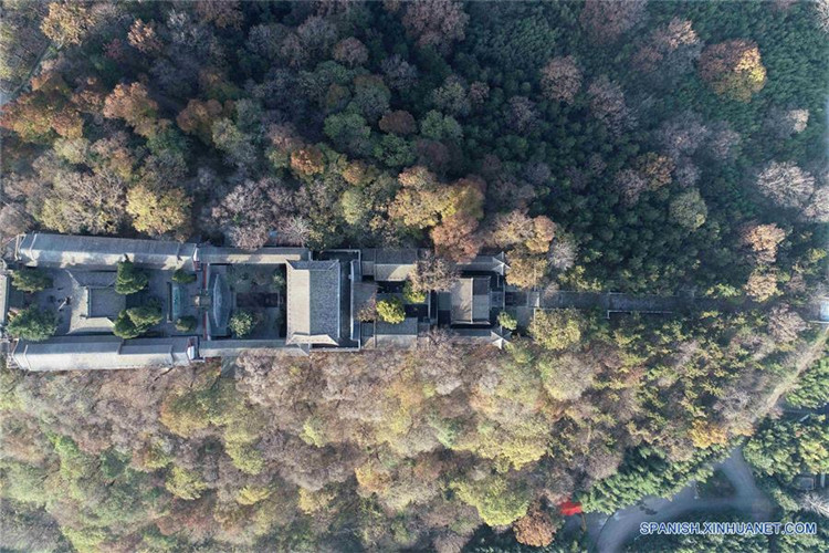 Vista aérea del 5 de diciembre de 2019 del paisaje matutino del lugar escénico cultural taoísta del Templo Louguantai del distrito Zhouzhi en Xi'an, capital de la provincia de Shaanxi, en el noroeste de China. El Templo Louguantai es el lugar donde el filósofo chino Laozi, fundador del taoísmo, predicó sus pensamientos.