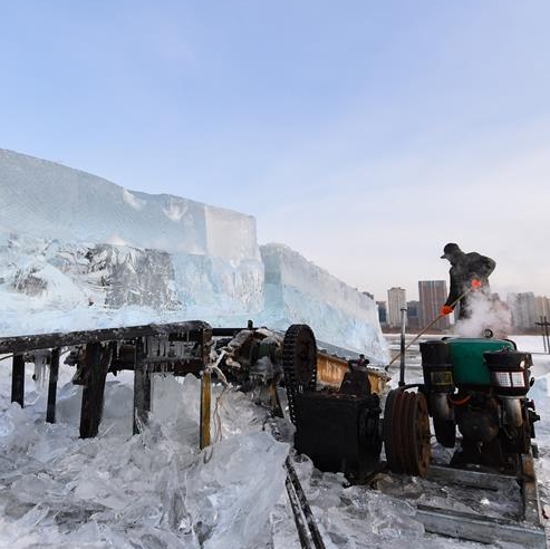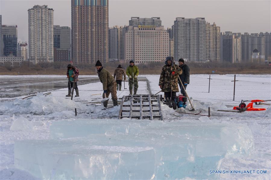 Trabajadores recolectan hielo del Río Songhua en Harbin, capital de la provincia de Heilongjiang, en el noroeste de China, el 11 de diciembre de 2019. Los cubos de hielo recolectados del Río Songhua congelado se utilizarán en la decoración de la ciudad.