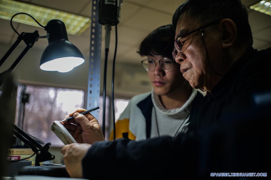 Imagen del 25 de diciembre de 2019 de Li Chunke enseñando a un estudiante sobre el diseño de patrón de tallado en un taller del Colegio Politécnico de la Industria Ligera de Beijing, en Beijing, capital de China. El tallado de dientes, que originalmente significa tallado en marfil, es un arte tradicional de la China antigua. Este representó el apogeo del arte popular en China durante la dinastía Qing (1644-1911) y se hizo popular en las decoraciones para la corte real. China ha intensificado sus esfuerzos en la protección de la vida silvestre a lo largo de los años. El 31 de diciembre de 2016, China declaró que obligaría a detener por completo su comercio interno de marfil en el plazo de un año. El 31 de diciembre, el último día de 2017, el procesamiento o venta de marfil y sus productos se ilegalizó oficialmente en China con la entrada en vigor de la prohibición total. Hoy en día los talladores utilizan colmillos de mamut o cornamentas como sustitutos. Li Chunke, un heredero del patrimonio cultural inmaterial a nivel nacional de la habilidad de tallado, ahora está enseñando y transmitiendo el oficio en la Academia Nacional de Artes de China, el Instituto de Tecnología de la Moda de Beijing y el Colegio Politécnico de la Industria Ligera de Beijing.