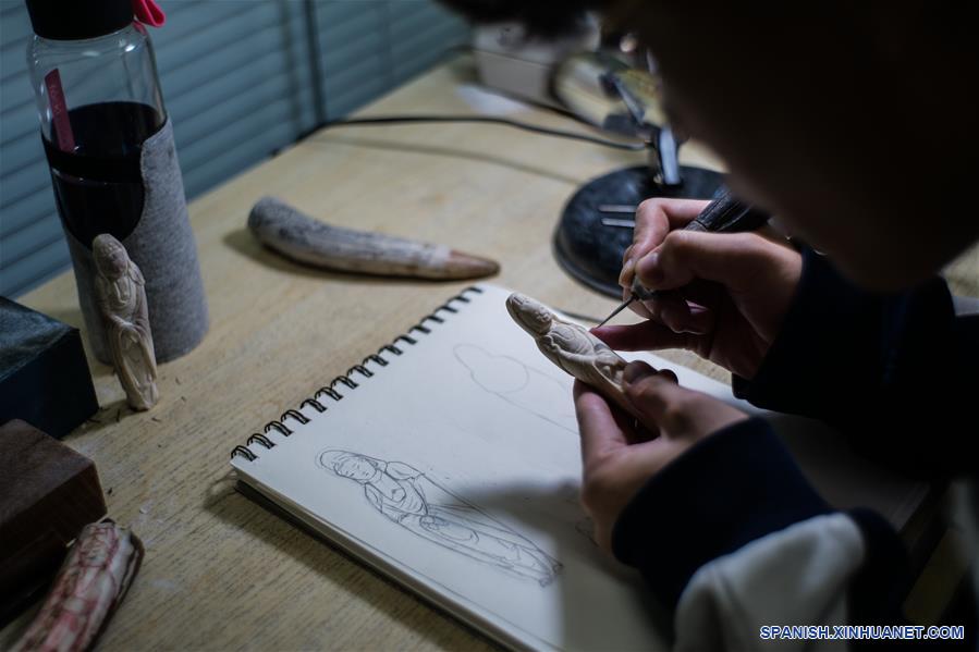 Imagen del 25 de diciembre de 2019 de un estudiante de Li Chunke tallando de acuerdo a bocetos en un taller del Colegio Politécnico de la Industria Ligera de Beijing, en Beijing, capital de China. El tallado de dientes, que originalmente significa tallado en marfil, es un arte tradicional de la China antigua. Este representó el apogeo del arte popular en China durante la dinastía Qing (1644-1911) y se hizo popular en las decoraciones para la corte real. China ha intensificado sus esfuerzos en la protección de la vida silvestre a lo largo de los años. El 31 de diciembre de 2016, China declaró que obligaría a detener por completo su comercio interno de marfil en el plazo de un año. El 31 de diciembre, el último día de 2017, el procesamiento o venta de marfil y sus productos se ilegalizó oficialmente en China con la entrada en vigor de la prohibición total. Hoy en día los talladores utilizan colmillos de mamut o cornamentas como sustitutos. Li Chunke, un heredero del patrimonio cultural inmaterial a nivel nacional de la habilidad de tallado, ahora está enseñando y transmitiendo el oficio en la Academia Nacional de Artes de China, el Instituto de Tecnología de la Moda de Beijing y el Colegio Politécnico de la Industria Ligera de Beijing.