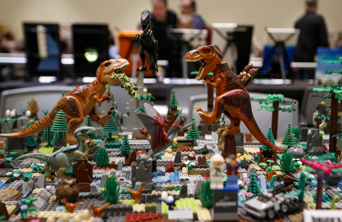 Dinosaurios hechos con piezas de Lego se presentan en Bricks LA, en Los Ángeles, Estados Unidos, el 12 de enero de 2020.