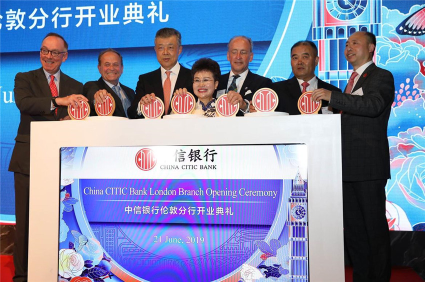 Li Qingping (centro), presidenta de China CITIC Bank, en la ceremonia de apertura de la sucursal del banco en Londres el 21 de junio.
