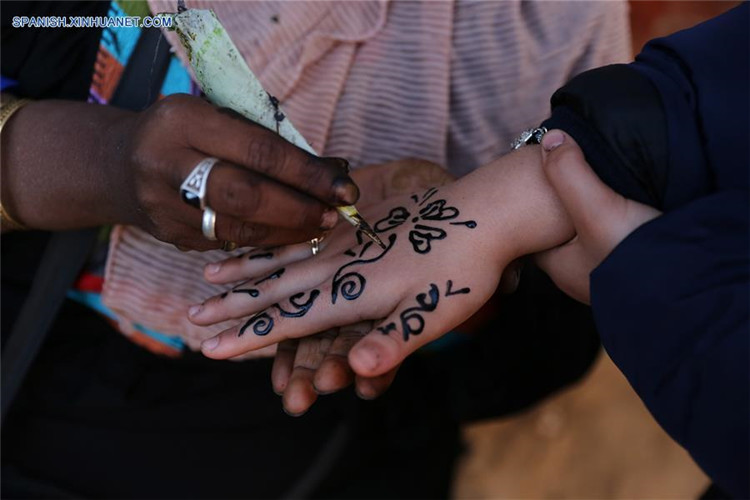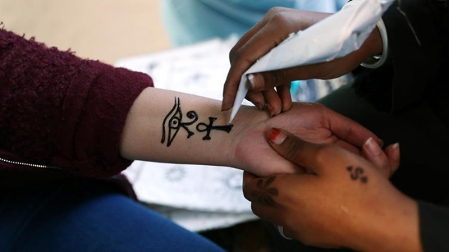 Imagen del 12 de febrero de 2020 de una artista dibujando tatuajes de henna en la mano de una mujer, en Aswan, Egipto. En los poblados de Nubia en el Alto Egipto, provincia de Aswan junto al río Nilo, es común ver a habitantes o a mujeres turistas extranjeras sentadas frente a un artista de henna de Nubia en una banqueta en un colorido bazar o dentro de una cafetería para realizarse un tatuaje en su mano.