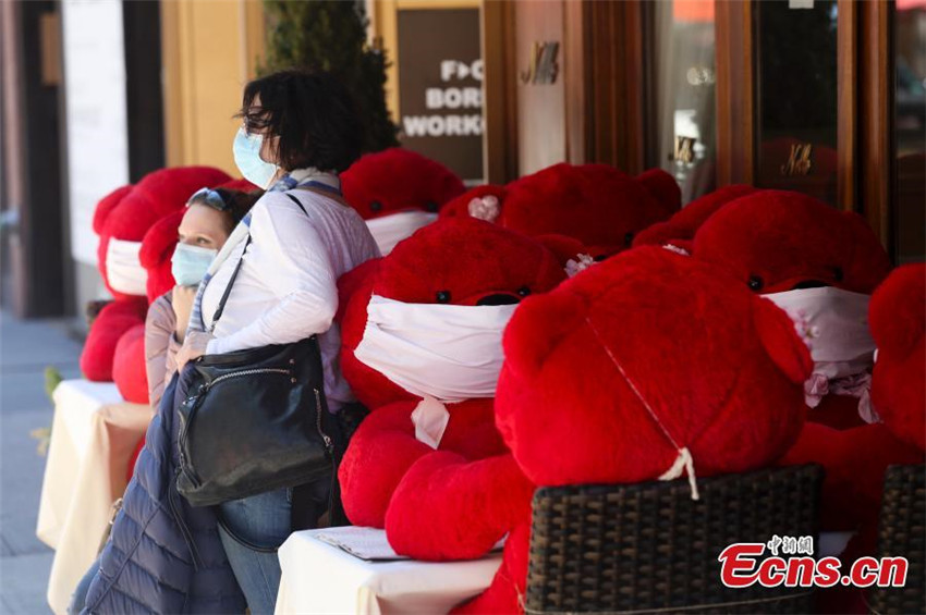 Foto tomada el 28 de abril de 2020 en la que aparecen varios osos de peluche con máscaras protectoras sentados en un restaurante en la ciudad de Nueva York, EE. UU.