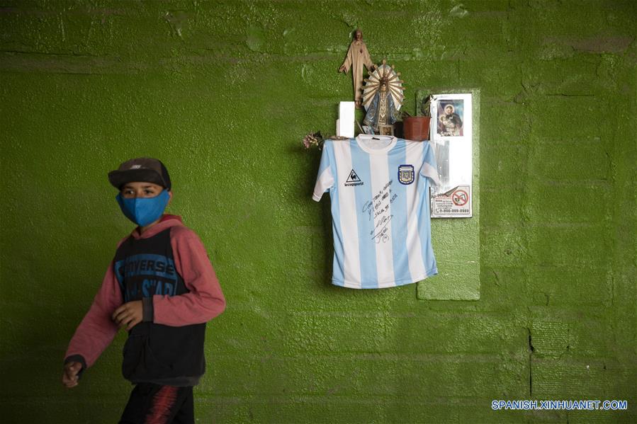 Un niño porta una mascarilla mientras camina frente a una camiseta de la selección nacional de fútbol argentina firmada por el ídolo Diego Armando Maradona, en un comedor comunitario, en la localidad de José C. Paz, a 47 kilómetros de la ciudad de Buenos Aires, capital de Argentina, el 8 de mayo de 2020. Miles de personas de Argentina y del exterior se han sumado a una impresionante iniciativa solidaria por la cual donan alimentos para un distrito de escasos recursos del país a cambio de participar en el sorteo de una histórica camiseta de fútbol firmada por Diego Armando Maradona para ayudar en un contexto social adverso por la pandemia de la enfermedad causada por el nuevo coronavirus (COVID-19).