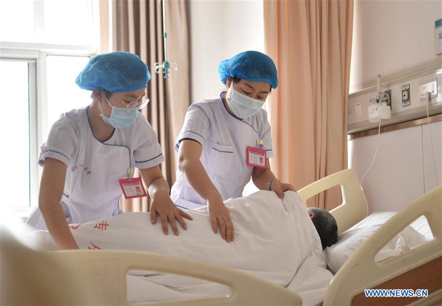 Enfermeras atienden a un paciente en el Hospital Popular de la Ciudad de Dingzhou en Dingzhou, en la provincia de Hebei, en el norte de China, el 12 de mayo de 2020. El Día Internacional de la Enfermería se celebra anualmente el 12 de mayo.