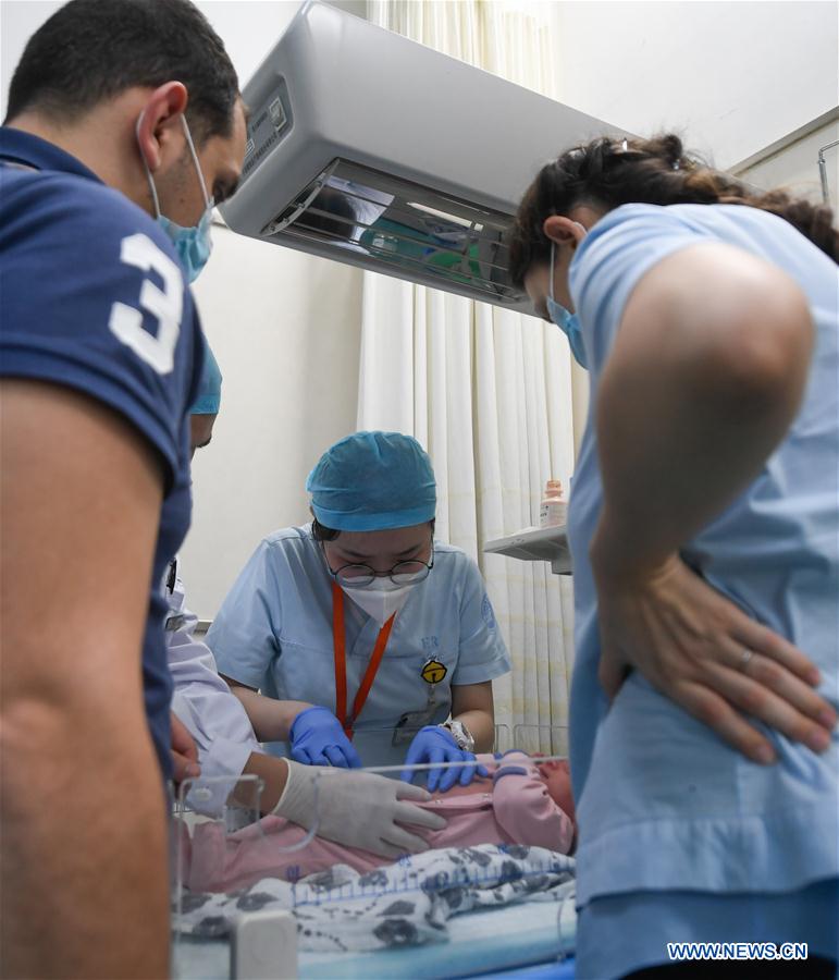 Imagen del 11 de mayo de 2020 de la enfermera Ren Yidan (c) desinfectando el cordón umbilical del recién nacido de una pareja jordana, en el departamento de emergencias del Hospital Infantil de la Facultad de Medicina de la Universidad de Zhejiang en Hangzhou, provincia de Zhejiang, en el este de China. El departamento de emergencias brinda servicios médicos las 24 horas y atiende a más de 400.000 pacientes al año.