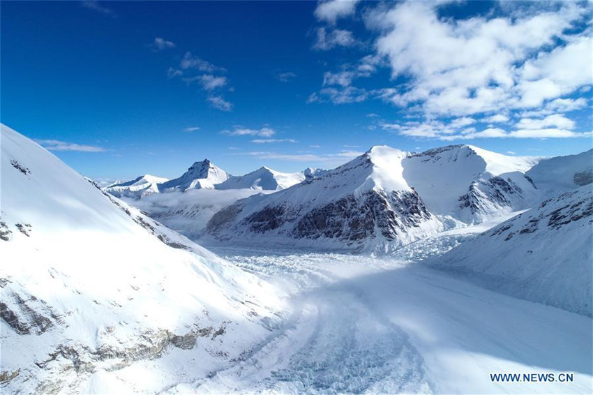 Fotografía aérea tomada el 22 de mayo de 2020 retratando la vista del glaciar East Rongbuk en el Monte Qomolangma.