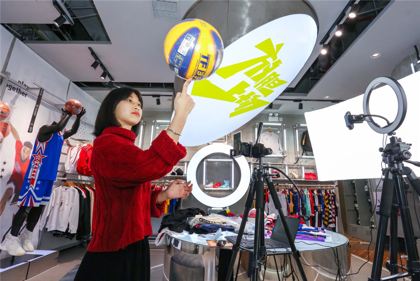 Una vendedora realiza transmisiones en vivo en una tienda de ropa deportiva en Jinjiang, provincia de Fujian, el 2 de abril.