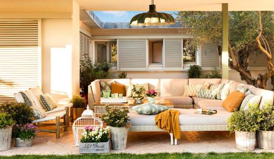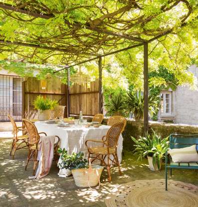 Las trepadoras son la opción más natural para llenar de frescor el porche. Aquí la glicina se integra muy bien con la pérgola metálica elegida por el equipo de Influenza y los muros de piedra. Las glicinas necesitan estructuras sólidas debido al peso de sus ramas. Las fibras naturales de las sillas (de Sacum), las cestas o la lámpara (de India & Pacific) dan calidez a este oasis de frescor.