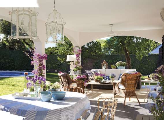 Este porche es como un salón muy acogedor, pero en el jardín. La interiorista Isabel Flores se encargó de actualizarlo. Lo pintó de blanco para darle luz y lo organizó en dos zonas: comedor y estar. Los arcos han marcado la distribución de las dos zonas.