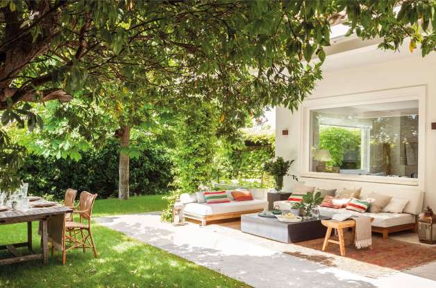 El porche de este chalé vive una segunda juventud gracias al lavado de cara que le ha hecho la decoradora Ajanta Velasco.“El suelo del exterior era de barro rojizo, pero lo sustituimos por una piedra caliza campaspero blanca con algunos matices grises y acabado irregular" explica la decoradora. Ahora tiene un look muy actual reforzado también por los muebles de líneas rectas en tonos claros. Vuelve a ver la fotos de esta casa nueva sin mudarse.