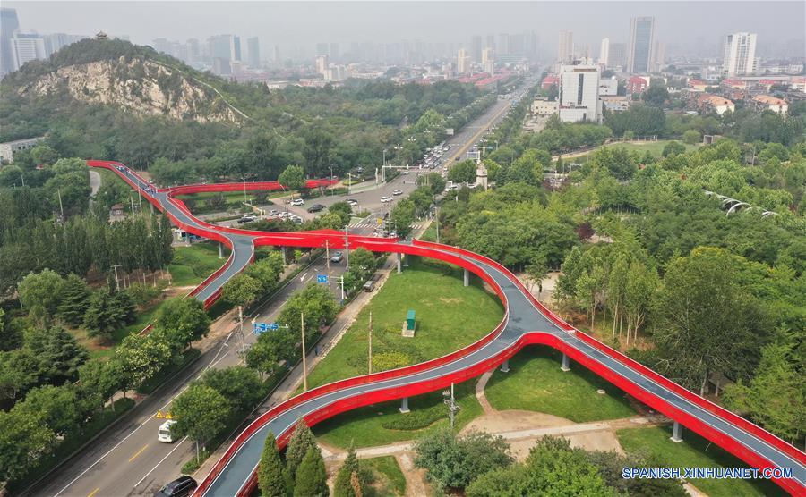 Vista aérea del 11 de julio de 2020 de una parte del "camino verde" en la ciudad de Tangshan, en la provincia de Hebei, en el norte de China. La primera fase del proyecto del "camino verde", que incluye ocho puentes para hacer turismo y conectar varios jardines de la ciudad, entró en la etapa de operación de prueba.