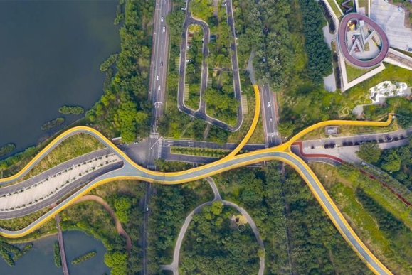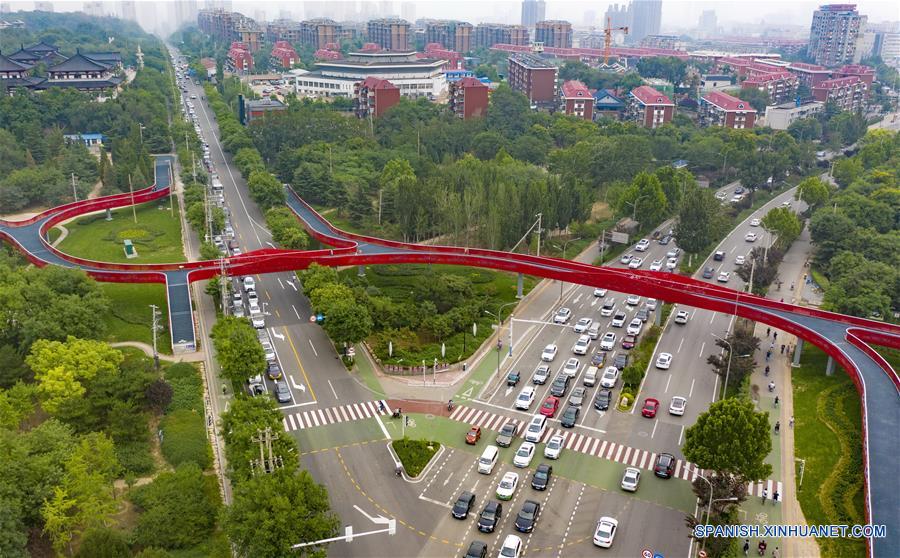 Vista aérea del 10 de julio de 2020 de una parte del "camino verde" en la ciudad de Tangshan, en la provincia de Hebei, en el norte de China. La primera fase del proyecto del "camino verde", que incluye ocho puentes para hacer turismo y conectar varios jardines de la ciudad, entró en la etapa de operación de prueba.