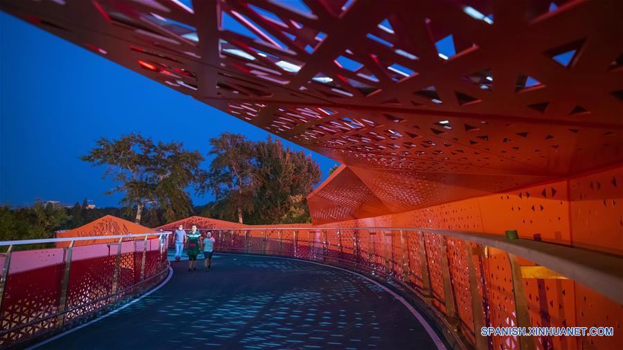 Imagen del 10 de julio de 2020 de personas caminando por el "camino verde" en la ciudad de Tangshan, en la provincia de Hebei, en el norte de China. La primera fase del proyecto del "camino verde", que incluye ocho puentes para hacer turismo y conectar varios jardines de la ciudad, entró en la etapa de operación de prueba.