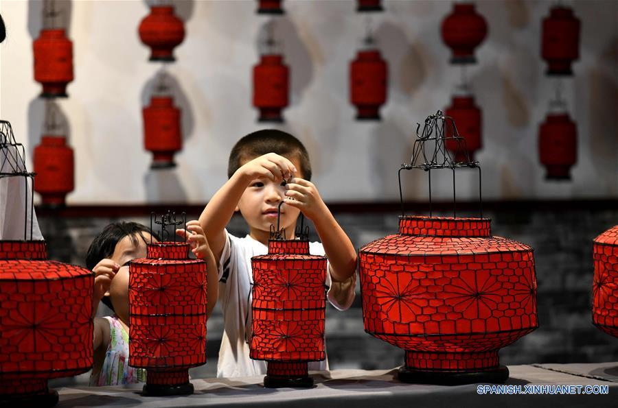 Niños observan linternas elaboradas a mano en una zona de industria cultural en el distrito de Qiaoxi de la ciudad de Shijiazhuang, en la provincia de Hebei, en el norte de China, el 10 de agosto de 2020. Qiaoxi ha organizado una serie de actividades para enriquecer las vacaciones de verano de los niños y promover el patrimonio cultural intangible.